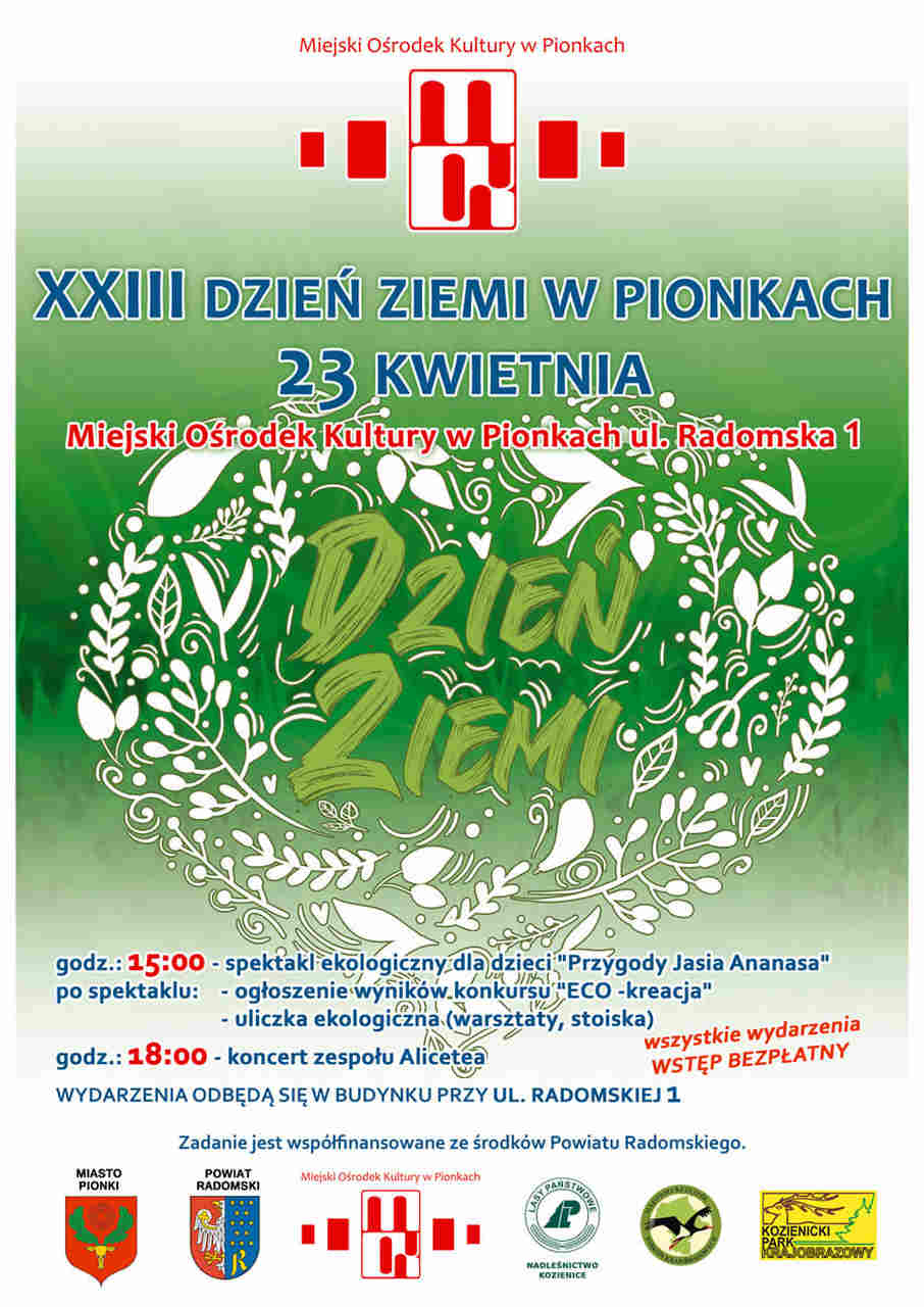 23 kwietnia Miejski Ośrodek Kultury w Pionkach, ul Radomska 1, zaprasza na XXIII Dzień Ziemi.