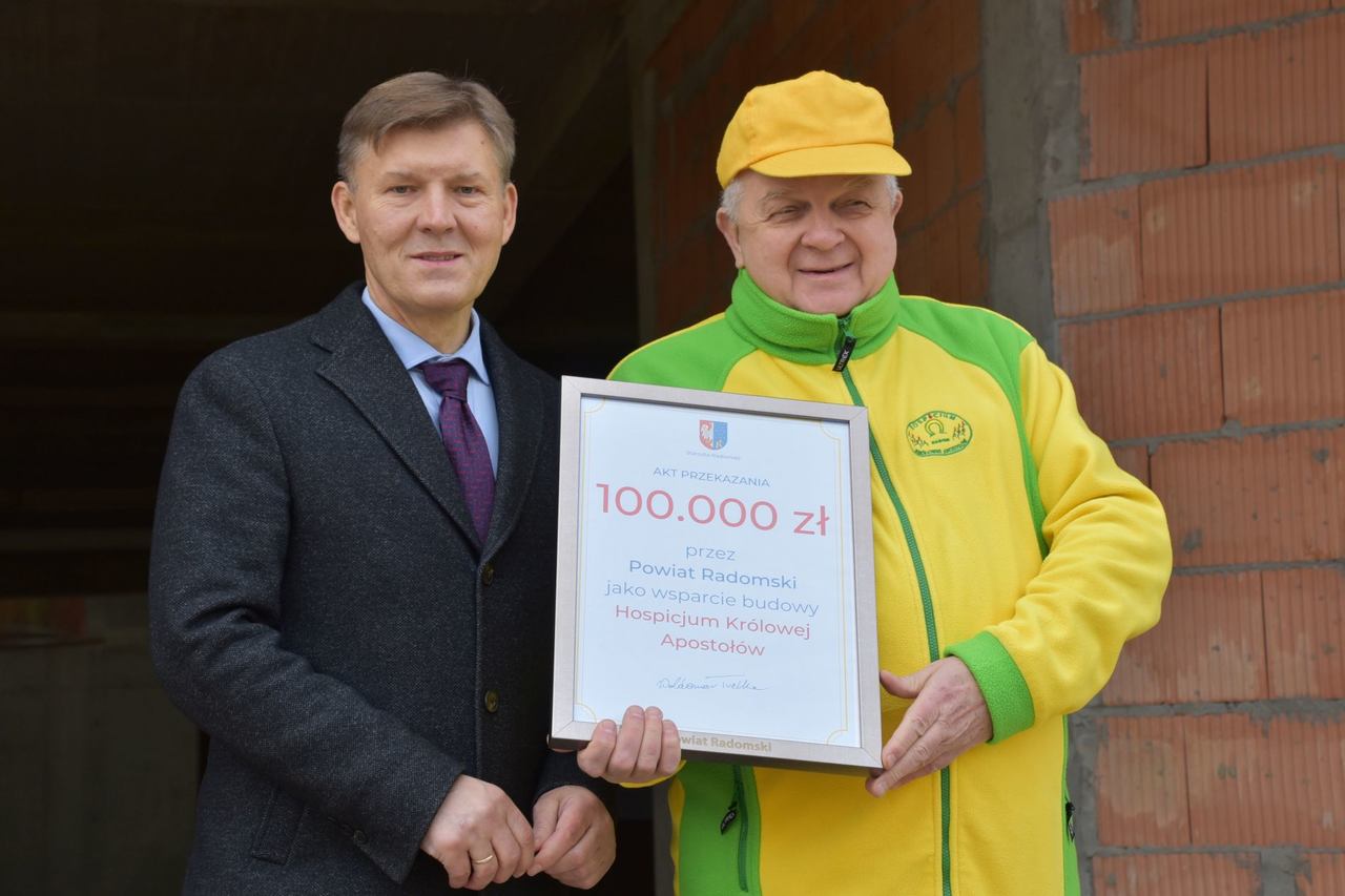 – „Przekazujemy 100 tysięcy złotych i jest to już druga nasza “setka”. Trzecią zaplanowaliśmy na rok 2023. Gratuluję i dziękuję księdzu Markowi Kujawskiemu za tą niełatwą pracę jakąś wykonujecie dla chorych. Chciałbym przypomnieć, że w 2021 roku budowę wspierały też inne samorządy naszego powiatu, gmina Gózd 20 tys. zł, gmina Jedlnia Letnisko, 20 tys. zł, Wolanów, Zakrzew po 10 tys. zł. Natomiast w 2022 swoje wsparcie przekazały: gmina Gózd, 20 tys. zł, gmina Pionki, 10 tys. zł, Wolanów i Zakrzew również po 10 tys. zł.” – powiedział Waldemar Trelka, starosta radomski.