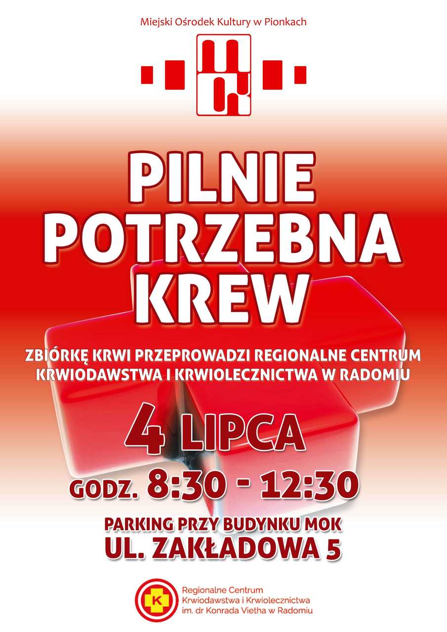 Regionalne Centrum Krwiodawstwa i Krwiolecznictwa w Radomiu zawiadamia, że pilnie potrzebuje krwi – jej zasoby są niewielkie, a zapotrzebowanie na nią – ogromne. Dlatego wspólnie z MOK Pionki zaprasza na zbiórkę krwi. Krwiobus stanie tym razem na parkingu przed Miejskim Ośrodkiem Kultury w Pionkach, ul. Zakładowa 5.