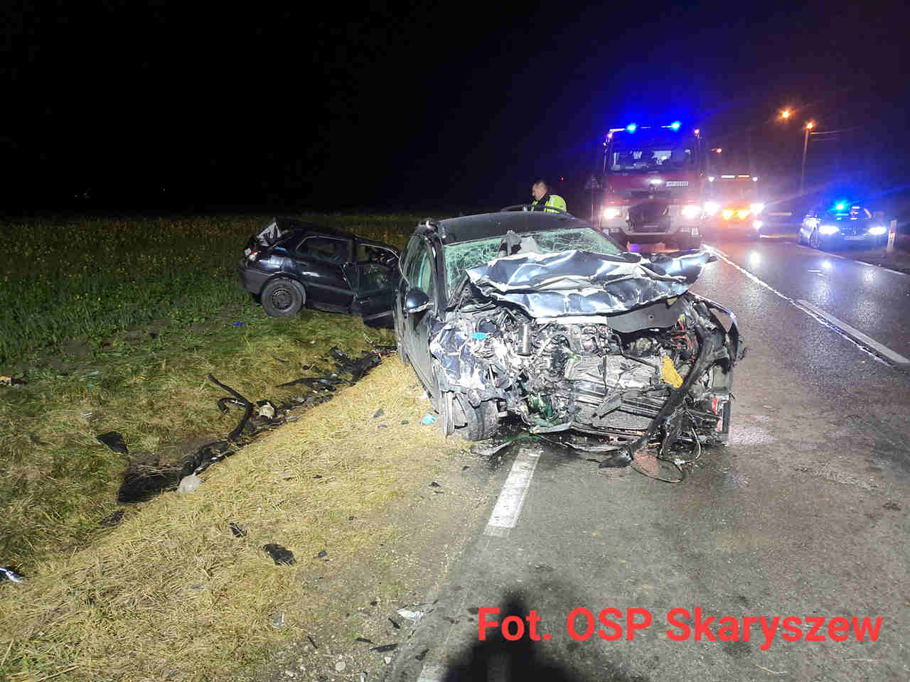 Kierujący golfem poniósł śmierć na miejscu. Drugim autem podróżowała pięcioosobowa rodzina z gminy Skaryszew. Cztery dorosłe osoby oraz 1,5 roczne dziecko zostali przewiezieni do szpitala.