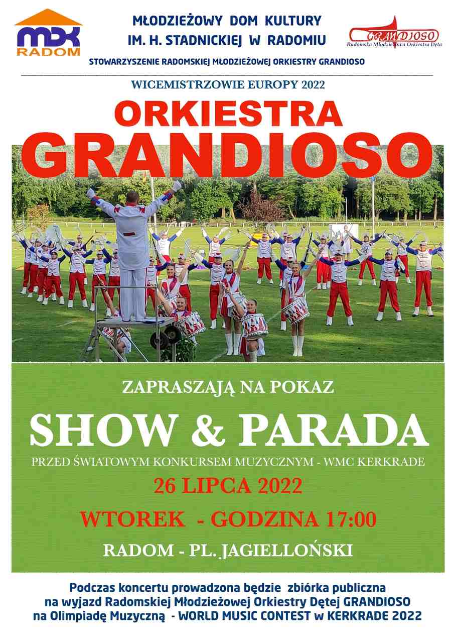Widowiskowe wydarzenie rozpocznie się we wtorek, 26 lipca, o godzinie 17:00 na Placu Jagiellońskim. Młodzieżowa Orkiestra Dęta Grandioso organizuje show i Paradę Marszową. Występ poprzedza wyjazd Orkiestry na Światowy Konkurs Muzyczny w Kerkrade, w Holandii.