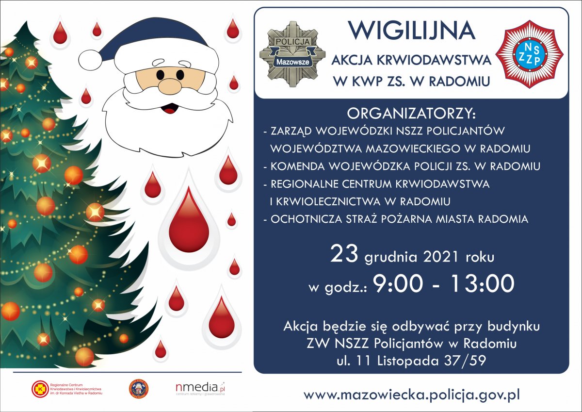 Funkcjonariusze zapraszają i zachęcają wszystkich mieszkańców Radomia i okolic do oddawania krwi. Zbiórka krwi zostanie przeprowadzona 23 grudnia (czwartek) w godz.9-13 na parkingu przed budynkiem ZW NSZZ Policjantów na terenie KWP zs. w Radomiu przy ul. 11 Listopada 37/59.