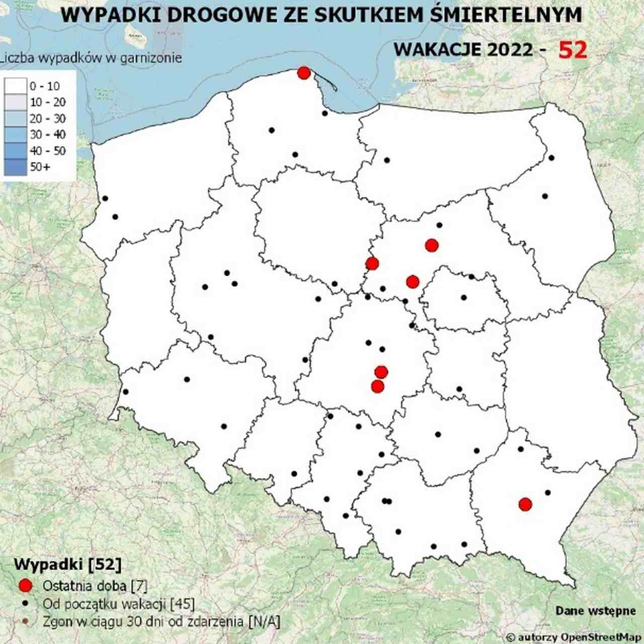 Po raz 4. Polska Policja w okresie wakacyjnym codziennie aktualizuje – ku przestrodze – mapę wypadków drogowych ze skutkiem śmiertelnym. Od początku wakacji do niedzieli, 3 lipca, odnotowano już 57 takich zdarzeń.