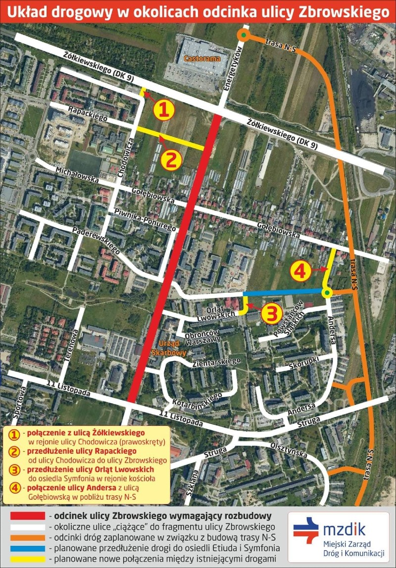 Warto na wstępie przypomnieć, że w trakcie konsultacji zaproponowano cztery konkretne sposoby służące odciążeniu ulicy Zbrowskiego i ułatwienie wyjazdu z dwóch osiedli. I tak 65 % ankietowanych opowiedziało się za utworzeniem prawoskrętnych połączeń z ulicą Żółkiewskiego, w okolicy ulicy Chodowicza. Ponad 73 % badanych było natomiast za przedłużeniem ulicy Rapackiego, od ulicy Chodowicza do Zbrowskiego. Pomysł przedłużenia ulicy Orląt Lwowskich do osiedla Symfonia w rejonie kościoła poparło ponad 56,3% respondentów. I wreszcie 70% uczestników konsultacji opowiedziało się za proponowaną koncepcją wykonania połączenia ulicy Andersa z ulicą Gołębiowską w pobliżu trasy N-S.