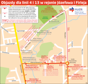 MZDiK informuje, że autobusy linii 4 będą zatrzymywały się na przystankach Aleksandrowicza / Warszawska (NŻ) 03 (pomiędzy Warszawską a mostem nad Mleczną) i Józefów / Szpital 01 (w stronę ronda). Z kolei autobusy linii 13 na trasie objazdu nie będą stawać nigdzie pomiędzy przystankami Józefów / Szpital 04 (na pętli) a Firlej / Cmentarz 05 (przed nekropolią).