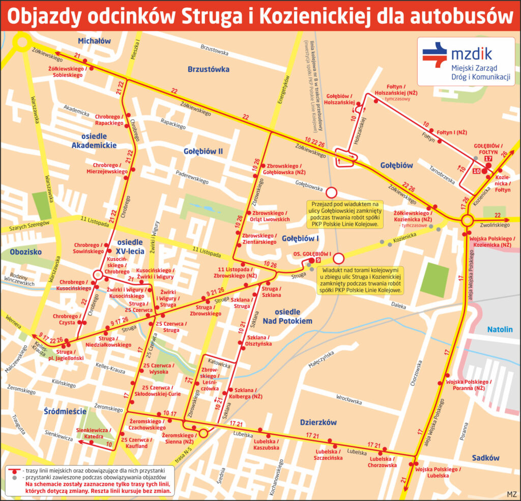 Miejski Zarząd Dróg i Komunikacji informuje, że w związku z zamknięciem wiaduktu u zbiegu ulic Struga i Kozienickiej od 30 stycznia zostaną wprowadzone objazdy. Zmiany tras będą dotyczyć również autobusów linii 9, 10, 17, 21, 22 i 26.
