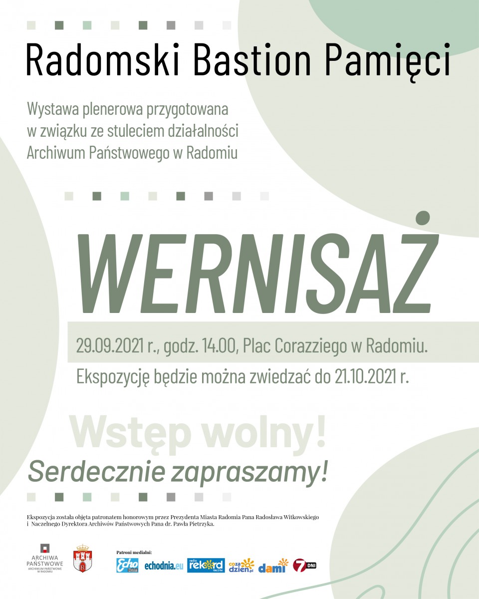 Tego samego dnia o godz. 14:00 na Placu Corazziego w Radomiu zostanie otwarta wystawa plenerowa zatytułowana „Radomski Bastion Pamięci – 100 lat Archiwum Państwowego w Radomiu”. Na planszach znajduje się zarys dziejów Archiwum oraz kopie dokumentów z wydawnictwa pt. „Radomski Bastion Pamięci. 100 dokumentów na stulecie Archiwum Państwowego w Radomiu”. Wystawa będzie prezentowana przez miesiąc.