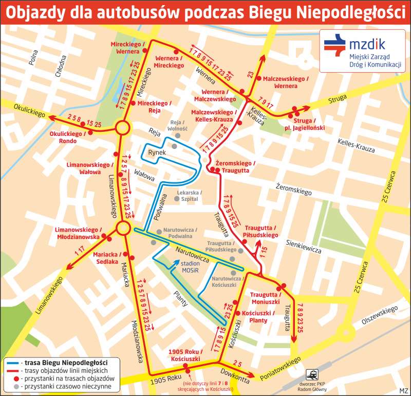 O zmianach w organizacji ruchu informuje Miejski Zarząd Dróg i Komunikacji w Radomiu także w kontekście najbliższej soboty. Tego dnia obchodzone będzie Narodowe Święto Niepodległości. Z tej okazji w mieście zaplanowano m.in. Bieg Niepodległości.