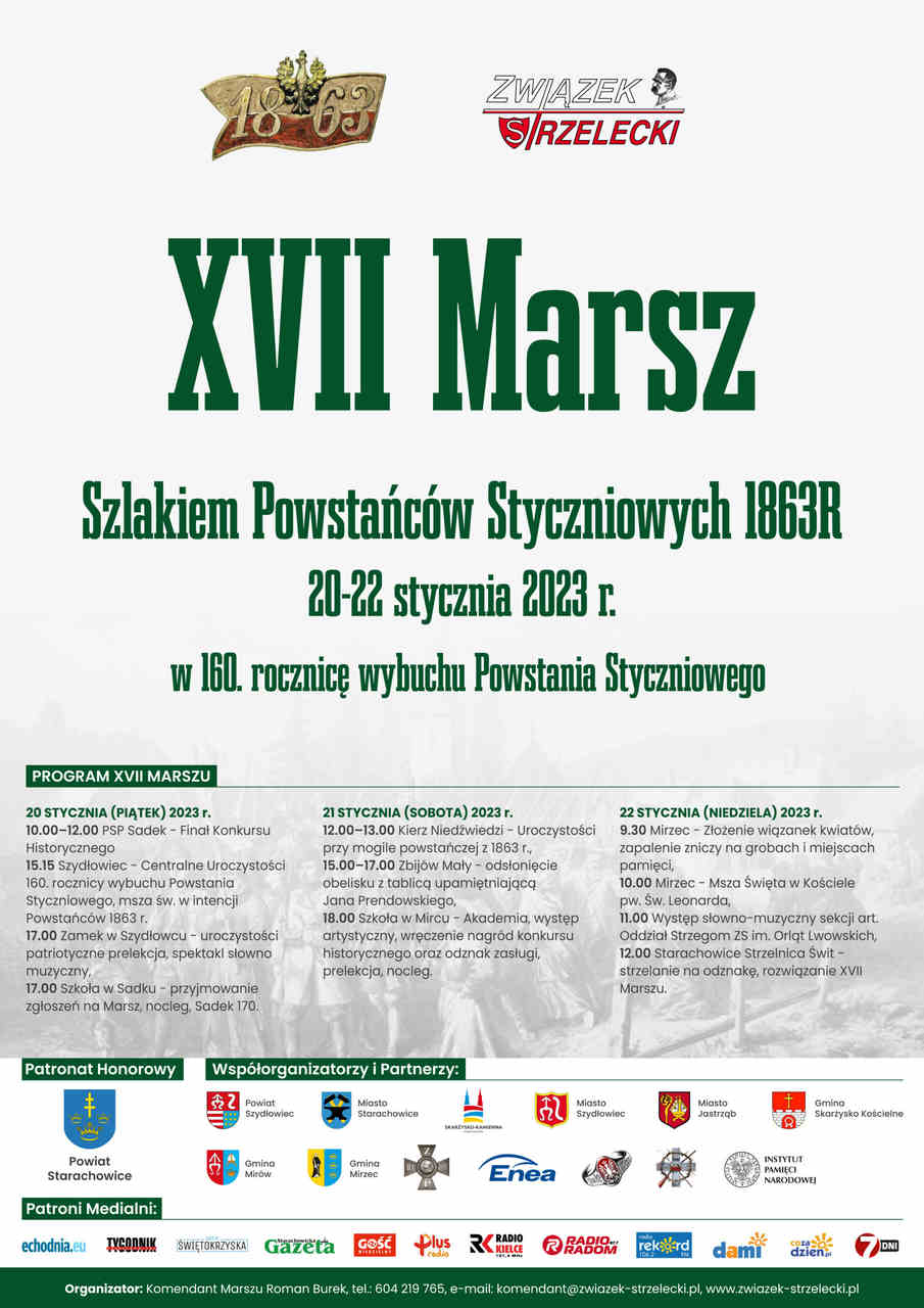 XVII Marsz Szlakiem Powstańców Styczniowych 1863R odbędzie się 21 stycznia 2023. Cały program – zarówno marszu, jak i tegorocznych obchodów – znajduje się na stronie organizatora (link). O tym, co będzie się działo w ciągu trzech dni, szczegółowo informuje również plakat: